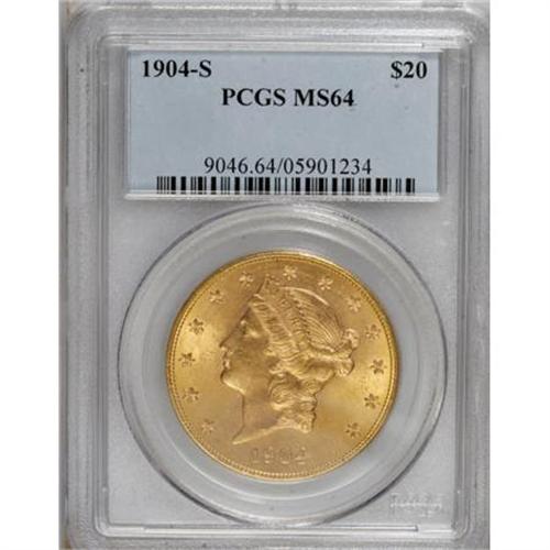 <B>1904-S $20 MS64 PCGS.</B></I> The highly lustrous honey-golden surfaces are imbued with subtle rose accents on each side. Most of the design elements are sharply struck, except for two or three of the obverse stars and the tops of a few letters in LIBERTY. A couple of minor abrasions in the obverse fields prevent the piece from being a Gem. <BR><BR><B>Coin Engraver:</B> James B. Longacre<BR><BR><b>Shipping:</b> Coins & Currency (<a target="_blank" href="http://www.heritageauctions.com/common/shipping.php">view shipping information</a>)