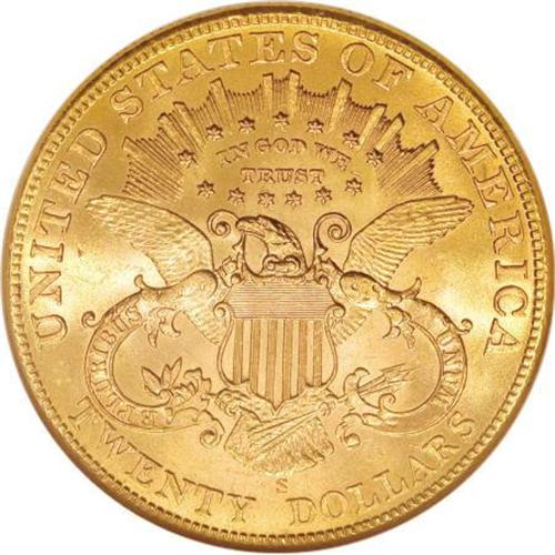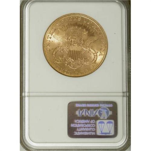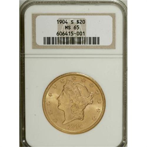 <B>1904-S $20 MS65 NGC.</B></I> This is a highly attractive Gem double eagle, with deep golden-rose toning and intense, coruscating mint luster. All of the design elements are well struck and surface marks are minimal, although a shallow luster graze is noted in the upper left obverse field. Surprisingly, these San Francisco pieces sell for nearly the same price as an example from the Philadelphia Mint, from the same year and at the same grade level; even though many more of the P-mint coins have been certified at the MS65 grade level by NGC and PCGS. <BR><I>From The Vanek Collection.</B></I><BR><BR><b>Shipping:</b> Coins & Currency (<a target="_blank" href="http://www.heritageauctions.com/common/shipping.php">view shipping information</a>)