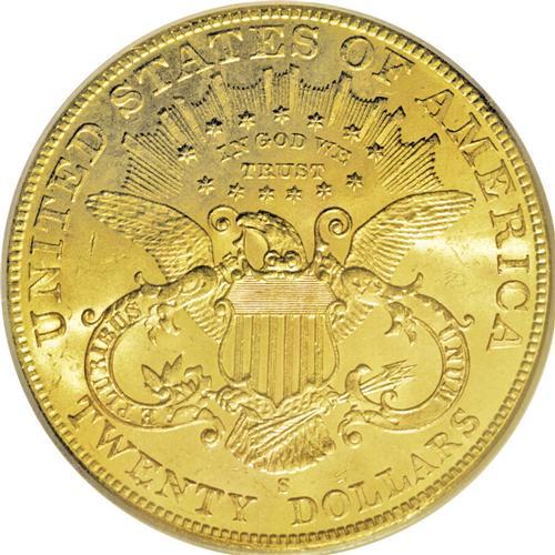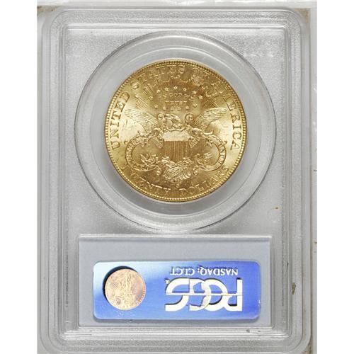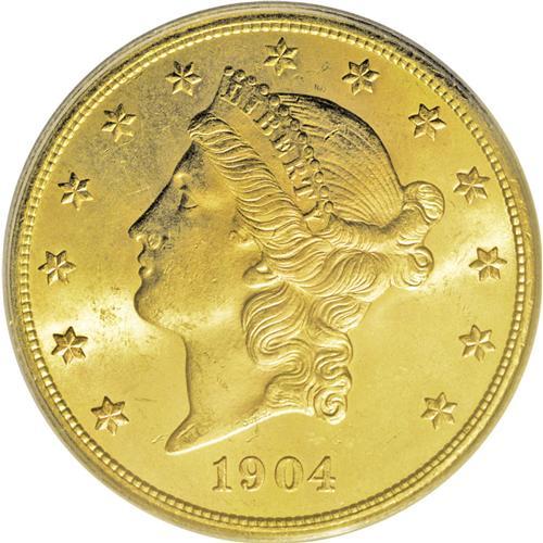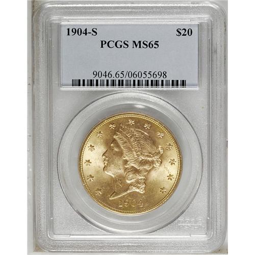 <B>1904-S<$20> MS65 PCGS.</B></I> A crisply struck and satiny Gem that has a clean reverse and an attractive obverse. Although the 1904-S has the second highest mintage of the series, it is many times scarcer than its Philadelphia Mint counterpart of the same year. As of (7/06), NGC and PCGS, combined, have only certified two examples in higher grades.