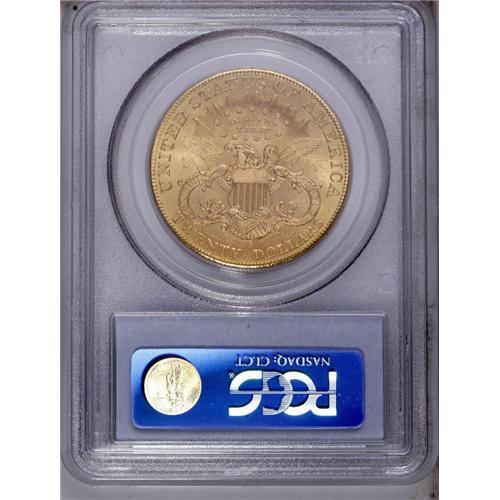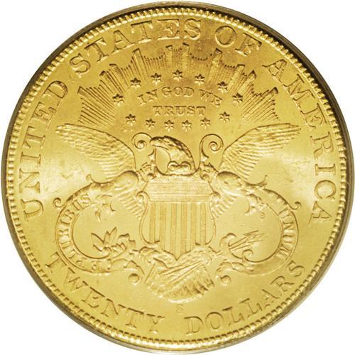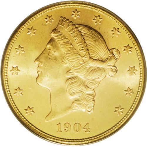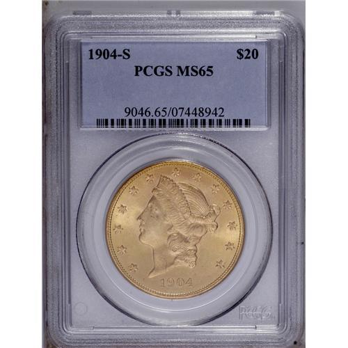 <B>1904-S<$20> MS65 PCGS.</B></I> The 1904 Philadelphia and San Francisco double eagles are ubiquitous in auctions, but seldom is the 1904-S found as fine as the present example. Cartwheel luster abounds from the pristine greenish-gold and reddish-gold surfaces. Even under a loupe, abrasions are minimal, and the strike is as bold as one could desire. The only conceivable quibble is a faint but obvious mintmark. Population: 104 in 65, 1 finer (1/06).