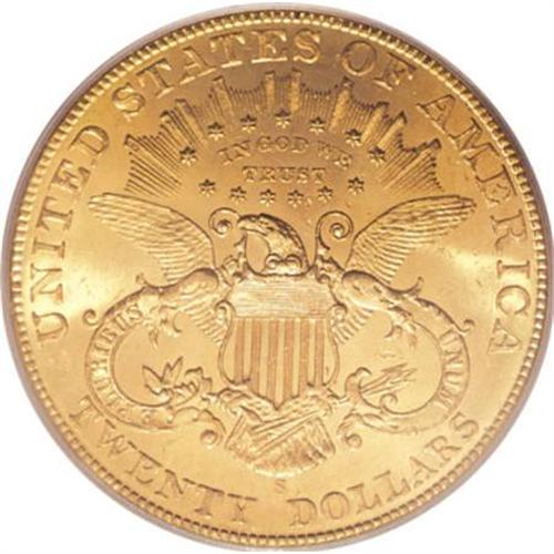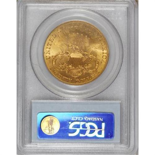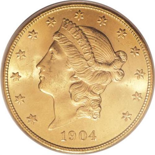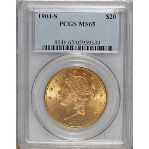 <B>1904-S $20 MS65 PCGS.</B></I> The high mintage 1904-S double eagle, with more than five million pieces originally produced, is well known as the most common Type III double eagle from the San Francisco Mint. Above the MS65 grade level, however, this issue is excessively rare, with a mere three examples certified at MS66 by the two major services, and none finer (6/07). The surfaces of the currently offered Gem are blessed with effulgent mint luster and alluring coloration. The design elements are sharply struck and surface marks are not excessive for the grade. <BR><BR><b>Shipping:</b> Coins & Currency (<a target="_blank" href="http://www.heritageauctions.com/common/shipping.php">view shipping information</a>)