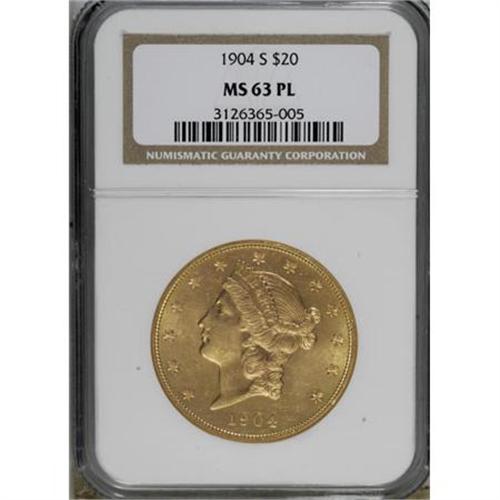 <B>1904-S $20 MS63 Prooflike NGC.</B></I> NGC Census: (12/3). PCGS Population (0/0). Mintage: 5,134,175. (#79046)<BR><BR><B>Coin Engraver:</B> James B. Longacre<BR><BR><b>Shipping:</b> Coins & Currency (<a target="_blank" href="http://www.heritageauctions.com/common/shipping.php">view shipping information</a>)
