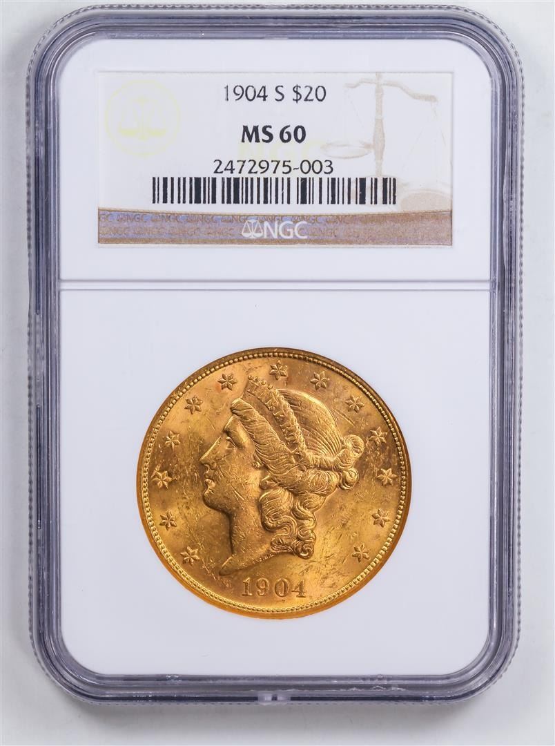 One 1904-S $20 Saint-Gaudens No Motto Double Eagle Gold Coin NGC MS60.