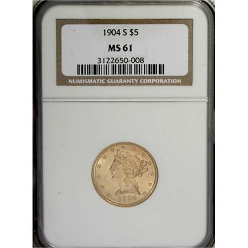 <B>1904-S $5 MS61 NGC.</B></I> . NGC Census: (23/38). PCGS Population (5/44). Mintage: 97,000. Numismedia Wsl. Price for NGC/PCGS coin in MS61: $975. (#8410)<BR><BR><B>Coin Engraver:</B> Christian Gobrecht<BR><BR><b>Shipping:</b> Coins & Currency (<a target="_blank" href="http://www.heritageauctions.com/common/shipping.php">view shipping information</a>)