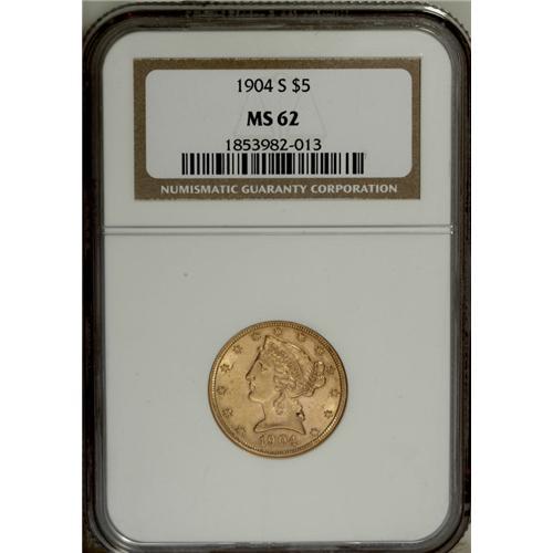 <B>1904-S $5 MS62 NGC.</B></I> Lustrous surfaces exhibit sharply struck motifs, and are adorned with pretty yellow-gold color. A few moderate marks on the obverse define the grade. The 1904-S is elusive in Mint State grades. Census: 23 in 62, 15 finer (1/07).<BR><BR><b>Shipping:</b> Coins & Currency (<a target="_blank" href="http://www.heritageauctions.com/common/shipping.php">view shipping information</a>)