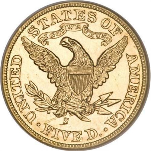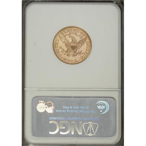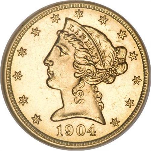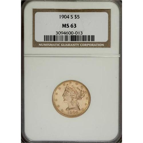 <B>1904-S $5 MS63 NGC.</B></I> A beautiful Select example of this popular low-mintage San Francisco half eagle issue, crisply struck with powerful luster that enlivens the yellow-gold surfaces. Only a few wispy abrasions in the fields preclude a finer designation. The 1904-S issue was little saved at the time of release, and unworn examples are elusive today. Census: 13 in 63, 5 finer (3/08).<BR><BR><B>Coin Engraver:</B> Christian Gobrecht<BR><BR><b>Shipping:</b> Coins & Currency (<a target="_blank" href="http://www.heritageauctions.com/common/shipping.php">view shipping information</a>)
