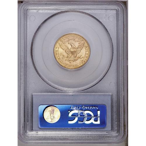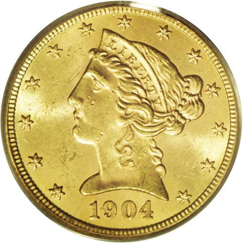 <B>1904-S<$5> MS63 PCGS.</B></I> Even with a mintage of 97,000 pieces, the 1904-S proves to be a very elusive coin in all grades of Mint State. This is a charming piece that shows richly lustrous yellow-gold surfaces that are free of all but the tiniest abrasions. Definitely a nice example for the grade. Population: 10 in 63, 7 finer (3/06). <BR><BR><B>Important notice:</B> Heritage usually auctions material at the rate of 200-250 lots per hour. On some occasions eBay Live bid software or the Internet may not be able to keep up with the pace of the auction. We recommend placing a realistic absentee bid now as insurance to avoid disappointment. Occasionally the auctioneer may eliminate or reject an eBay Live bid, and the auctioneer may also reopen a lot after the close of the eBay live bidding (usually because we missed an audience bid), and may reject your bid even if it shows you as the winning bidder. By bidding via eBay Live, you agree that Heritage may award the lot to another bidder at its sole discretion under the circumstances described above or any other reasonable circumstances. Since eBay bids are not shown to us until we open the lot on the floor, we treat those bids just like floor bids. In most cases the floor responds before the eBay bid is presented to us, due to Internet lag time, so for consistency we have made it a policy that floor bids are always considered first over tie eBay live bids. Also please note that all Heritage lots purchased through eBay Live carry a 20% Buyer's Premium. Please make sure you read the Terms and Conditions before you bid. This lot is being auctioned in conjunction with a live floor auction by Heritage Galleries & Auctioneers. All final auction and invoice information will be supplied by Heritage Galleries & Auctioneers, and all other information should be considered preliminary. Lot:2853 <BR><BR><B>Winning Notification and Billing:</B> After the FINAL session in this auction is complete, Heritage will send e-mail and snail mail invoices. This process normally takes several days. All final auction and invoice information will be supplied by Heritage Galleries & Auctioneers, and all other information should be considered preliminary. <BR><BR>This auction will be conducted on a live auction floor and over the Internet through eBay Live. If you choose to place an absentee bid, please take a moment to <font color='#0000ff'><u><a href='http://pages.ebay.com/liveauctions/help/before/laabsentee.html'>learn how eBay Live absentee bidding works</a></u></font><font color='#000000'>
