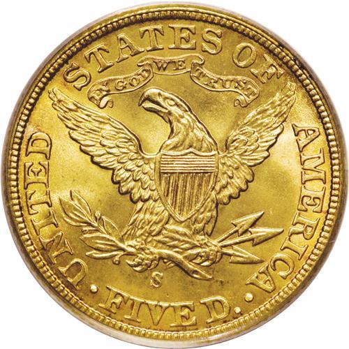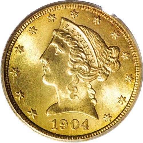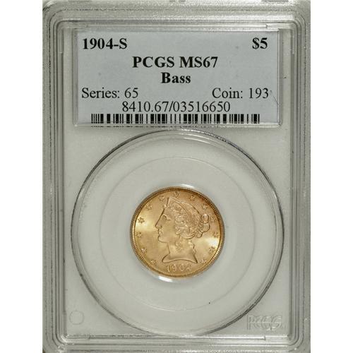<B>1904-S $5 MS67 PCGS.</B></I> An illustrious coin pedigreed to the Harry W. Bass Jr. Collection. In 1903 the San Francisco Mint produced 1.85 million half eagles, but in 1904 the number dropped precipitously, to only 97,000 pieces. In fact, the 1904-S half eagle is the lowest mintage S-mint since the 1894-S, which is also considered quite scarce. All of the other S-mint half eagle mintages during the 1895-1904 era range from more than 100,000 coins on the low side to a couple of million on the high side, in the case of the 1898-S, 1899-S, 1901-S, and 1903-S issues. An undoubted reason for the paucity of half eagles coined this year was San Francisco's prodigious output of double eagles, amounting to more than 5 million pieces. Concerning the 1904-S half eagle Jeff Garrett and Ron Guth write, "Most of the coins seen for the date are Extremely Fine or About Uncirculated. Mint State examples are quite rare; choice and gem specimens are seldom seen. There are just a couple of superb coins known, one of which is from the famous Eliasberg/Clapp Collection. There has been a very small number of coins offered at auction in the last two decades, the finest of which is the Harry W. Bass Jr. example, which graded MS-67 and sold for $29,900."<BR> In 1999 the Bass cataloger, describing the coin and discussing its previous auction appearance, wrote, "Intense cartwheel lustre and rich rose iridescence glow upon the satiny gem surfaces of this impressive half eagle. The 1904-S is a major rarity at any Uncirculated level--even MS-60 or MS-61--despite 97,000 having been minted. With regard to the MS-67 level, this is a dream coin, almost an illusion, but actually a reality. It is certainly far and away the finest example ever certified by PCGS and far and away the finest we have ever seen. ... In our February 1976 catalogue of the Montgomery Collection, Lot 2181, reads as follows: 'The rarity of 1904-S was first pointed out by John Jay Ford, Jr., in New Netherlands Coin Co. catalogues in the 1950s. Since that time we've kept a weather eye out for top-grade 1904-S half eagles and have seen very, very few. We have not handled even a single piece which equals the present lot. The <I>Scott Encyclopedia of U.S. Coins</B></I> notes that the 1904-S is "rare in Uncirculated grade," which apparently, if anything, is an understatement.' Funny how those comments still ring true after 23 years. ... Today in 1999 the preceding statement is still true, except that in 1999 gold coins are more popular than any time in numismatic history."<BR> Little needs to be added to that description, as it aptly befits the coin today--except, of course that the coin is equally as elusive as Ford pointed out in the 1950s, and even today this specimen, the finest graded at PCGS, is virtually without peer, save for a single MS67 piece at NGC. It is undoubtedly a match for the Bass coin (and therefore the Montgomery piece), as it shows a tiny tick just below star 8, completely undistracting but matching the Bass coin exactly. Population: 1 in 67, 0 finer (3/07).<BR><I>Ex: Dr. D.C. Montgomery Jr. Collection (Bowers and Ruddy Galleries, 2/1976), lot 2181; Bass II (Bowers and Merena, 10/1999), lot 1284, where it brought $29,900.</B></I><BR><I>From The Palakika Collection.</B></I><BR><BR><b>Shipping:</b> Coins & Currency (<a target="_blank" href="http://www.heritageauctions.com/common/shipping.php">view shipping information</a>)