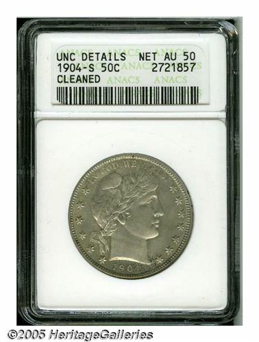 <B>1904-S<50C>--Cleaned--ANACS. Unc Details, Net AU50.</B></I> Lackluster from cleaning, the otherwise gray surfaces show light golden accents around the peripheries.