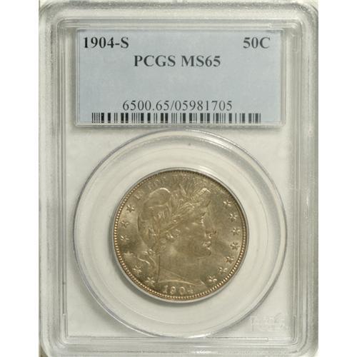 <B>1904-S 50C MS65 PCGS.</B></I> Among Gem quality Barber half dollars certified by PCGS, seven issues stand above all others for the lowest population. 1893-S ranks first with just five coins graded MS65 or finer, while six dates are tied for second position, each with just six pieces similarly graded by this service. It is no surprise that the 1904-S is on this list, along with 1896-O, 1900-O, 1901-O, 1902-O, and 1903. It is this last date that may surprise even knowledgeable collectors. This piece has satiny champagne surfaces with sharp design features and excellent eye appeal. It is a coin that will enhance most Barber half dollar collections. Population: 3 in 65, 3 finer (1/07).<BR><BR><b>Shipping:</b> Coins & Currency (<a target="_blank" href="http://www.heritageauctions.com/common/shipping.php">view shipping information</a>)