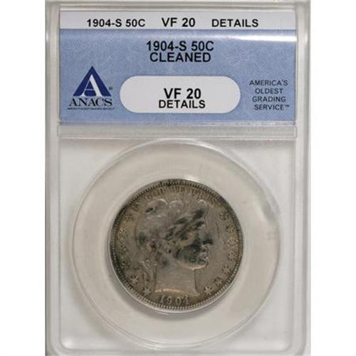 <B>1904-S 50C --Cleaned--ANACS. VF20 Details.</B></I> NGC Census: (1/43). PCGS Population (7/72). Mintage: 553,038. Numismedia Wsl. Price for NGC/PCGS coin in VF20: $450. (#6500)<BR><BR><B>Coin Engraver:</B> Charles E. Barber<BR><BR><b>Shipping:</b> Coins & Currency (<a target="_blank" href="http://www.heritageauctions.com/common/shipping.php">view shipping information</a>)