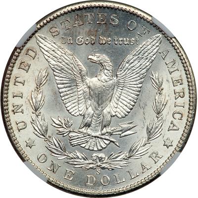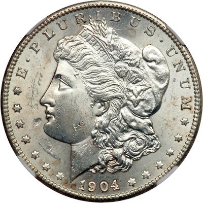 1904-S Morgan Dollar. NGC graded MS-62. A minute trace of toning on both sides. We note a minor planchet flaw in front of Liberty's chin. Nice cartwheel luster is evident over both sides (PCGS # 7294) .