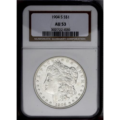 <B>1904-S<img border='0' src='http://www.heritagecoins.com/images/star.gif' width=10 height=10>$1> AU53 NGC.</B></I> A nearly untoned better date piece with no shortage of bright remaining luster. Obtrusive abrasions are absent. S-mint dollars from this decade are scarce in any grade. <BR><BR><B>Important notice:</B> Heritage usually auctions material at the rate of 200-250 lots per hour. On some occasions eBay Live bid software or the Internet may not be able to keep up with the pace of the auction. We recommend placing a realistic absentee bid now as insurance to avoid disappointment. Occasionally the auctioneer may eliminate or reject an eBay Live bid, and the auctioneer may also reopen a lot after the close of the eBay live bidding (usually because we missed an audience bid), and may reject your bid even if it shows you as the winning bidder. By bidding via eBay Live, you agree that Heritage may award the lot to another bidder at its sole discretion under the circumstances described above or any other reasonable circumstances. Since eBay bids are not shown to us until we open the lot on the floor, we treat those bids just like floor bids. In most cases the floor responds before the eBay bid is presented to us, due to Internet lag time, so for consistency we have made it a policy that floor bids are always considered first over tie eBay live bids. Also please note that all Heritage lots purchased through eBay Live carry a 20% Buyer's Premium. Please make sure you read the Terms and Conditions before you bid. This lot is being auctioned in conjunction with a live floor auction by Heritage Galleries & Auctioneers. All final auction and invoice information will be supplied by Heritage Galleries & Auctioneers, and all other information should be considered preliminary. Lot:3788 <BR><BR><B>Winning Notification and Billing:</B> After the FINAL session in this auction is complete, Heritage will send e-mail and snail mail invoices. This process normally takes several days. All final auction and invoice information will be supplied by Heritage Galleries & Auctioneers, and all other information should be considered preliminary. <BR><BR>This auction will be conducted on a live auction floor and over the Internet through eBay Live. If you choose to place an absentee bid, please take a moment to <font color='#0000ff'><u><a href='http://pages.ebay.com/liveauctions/help/before/laabsentee.html'>learn how eBay Live absentee bidding works</a></u></font><font color='#000000'>