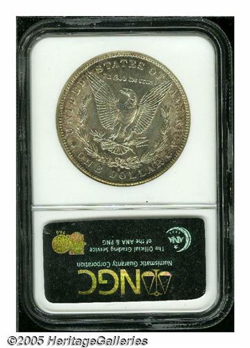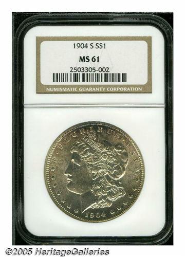 <B>1904-S<S$1> MS61 NGC.</B></I> Splashes of plum and navy-blue color endow the peripheries of this lustrous and nicely struck scarce date Silver Dollar. The right (facing) wing upper feathers are lightly die doubled, and the dies are moderately rotated clockwise.
