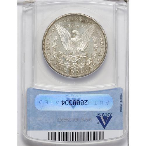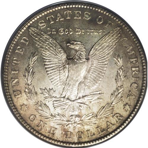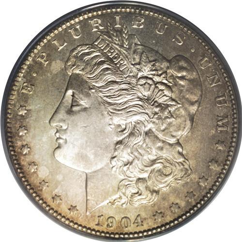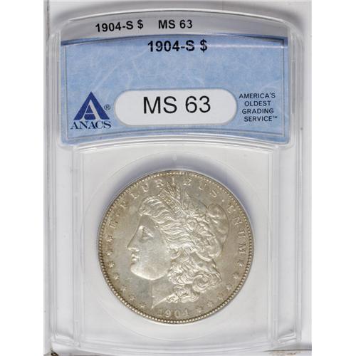 <B>1904-S<img border='0' src='http://www.heritagecoins.com/images/star.gif' width=10 height=10>$1> MS63 ANACS.</B></I> Mint State examples of this key issue are seldom seen, and when found they are apt to shallowly struck, with poor luster. This example is a pleasing exception, with radiant luster emanating from the silver-gold surfaces. The strike is bold on the eagle's breast and elsewhere, save for some softness on the hair above the ear. A few light abrasions on the cheek account for the grade.