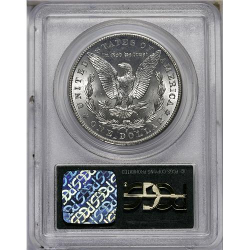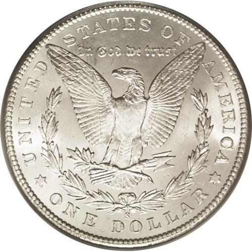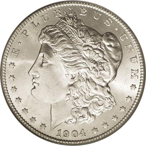 <B>1904-S<img border='0' src='http://www.heritagecoins.com/images/star.gif' width=10 height=10>$1> MS64 PCGS.</B></I> A crisply struck, untoned, and highly lustrous better date Morgan dollar. The reverse is impressively devoid of most marks, and only an occasional wispy luster graze denies classification as a full Gem. With tens of millions of silver dollars stored unwanted in Treasury vaults, production of the denomination ceased after 1904, and did not resume until it was required by the Pittman Act of 1918.<BR><I>From The Chicago-Ark Collection.</B></I>