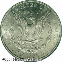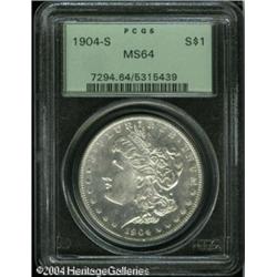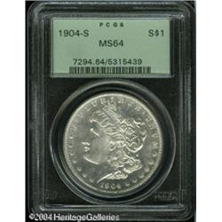 1904-S S$1 MS64 PCGS. Prior to 1940, the '04-S dol <B>1904-S S$1 MS64 PCGS.</B></I> Prior to 1940, the '04-S dollar was a great rarity in Uncirculated condition. In the early 1950's, one or more bags came out through Los Angeles banks, making Mint State specimens readily available on the market, at least in the short haul. No more hoards of this issue were forthcoming in the ensuing decades. None was represented in the Treasury releases of 1962-1964, or in the Redfield estate. The 1904-S in Mint State is now moderately scarce, most specimens being in the lower grade ranges from MS60 to 63. MS64 coins are scarce, and MS65 pieces are rare. The present near Gem features bright, lustrous surfaces that are nearly untoned. The obverse center is weakly struck, as is typical of the issue, resulting in a lack of definition in the hair over Liberty's ear. Unlike most of its counterparts in this grade range, it is only lightly abraded, revealing just a few minor abrasions on Liberty's cheek. <BR><BR><B>Important notice:</B> Heritage usually auctions material at the rate of 200-250 lots per hour. On some occasions eBay Live bid software or the Internet may not be able to keep up with the pace of the auction. We recommend placing a realistic absentee bid now as insurance to avoid disappointment. Occasionally the auctioneer may eliminate or reject an eBay Live bid, and the auctioneer may also reopen a lot after the close of the eBay live bidding (usually because we missed an audience bid), and may reject your bid even if it shows you as the winning bidder. By bidding via eBay Live, you agree that Heritage may award the lot to another bidder at its sole discretion under the circumstances described above or any other reasonable circumstances. Since eBay bids are not shown to us until we open the lot on the floor, we treat those bids just like floor bids. In most cases the floor responds before the eBay bid is presented to us, due to Internet lag time, so for consistency we have made it a policy that floor bids are always considered first over tie eBay live bids. Also please note that all Heritage lots purchased through eBay Live carry a 20% Buyer's Premium. Please make sure you read the Terms and Conditions before you bid. This lot is being auctioned in conjunction with a live floor auction by Heritage Galleries & Auctioneers. All final auction and invoice information will be supplied by Heritage Galleries & Auctioneers, and all other information should be considered preliminary. Lot:7753