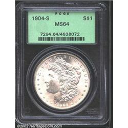 1904-S S$1 MS64 PCGS. Quantities of 1904-S Dollars dribbled out of government holdings through the 1950s. The distributing institutions were as varied as the Treasury Department building in Washington, D.C. and banks in the Los Angeles area. These coins served to trick dealers and collectors at the time into thinking that the '04-S was a plentiful date in Mint State. However, after the dispersal of the Treasury Department holdings in the early 1960s and the Redfield estate in the 1970s (neither of which contained any Uncirculated '04-S Dollars), specialists began to look upon this date with more respect. Today, this, the penultimate Morgan Dollar from the San Francisco Mint, is rightly regarded as one of the premier condition rarities in this long-lived series. Whereas most extant '04-S Dollars possess bothersome striking incompleteness in the centers, this lovely near-Gem is boldly struck on the hair over Liberty's ear and the eagle's breast feathers. The surfaces are softly frosted, and the number of bagmarks is minimal. Accuracy does compel us to mention, however, a pair of moderate distractions on the eagle's breast. Nevertheless, this is an attractive representative of this conditionally rare S-mint Morgan.From the Hans Poetsch Collection. Important notice: We expect to be auctioning lots at the rate of 200-250 per hour. Sometimes eBay Premier live bid software cannot keep up with that pace, so we strongly recommend that you place a realistic proxy bid now as insurance to avoid disappointment. Also please note that all Heritage/CAA lots purchased through eBay Premier carry a 20% Buyer's Premium. Please make sure you read the Terms and Conditions.