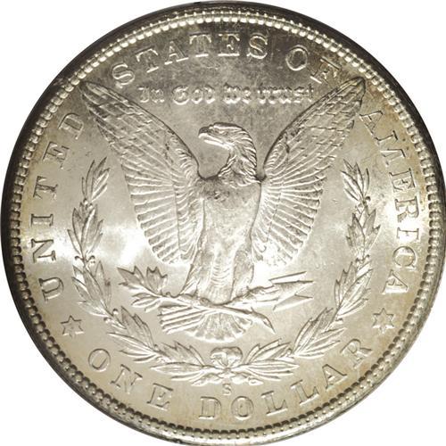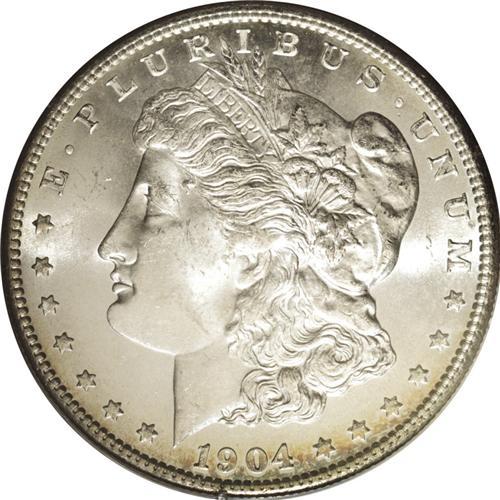 <B>1904-S<img border='0' src='http://www.heritagecoins.com/images/star.gif' width=10 height=10>$1> MS64 PCGS.</B></I> The '04-S is primarily known for its poor overall quality. One expects drab luster, dull gray surfaces, and a poor strike. However, what one finds on this coin is bright, sparkling mint luster, uniformly brilliant surfaces, and only slightly weak central details. Housed in a first generation PCGS holder.