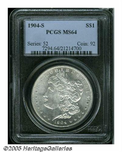 <B>1904-S<S$1> MS64 PCGS.</B></I> This is an impressive example for the grade with brilliant silvery white surfaces and soft, frosty luster. It is sharply struck and nearly mark-free. Although a moderately high mintage was accomplished in San Francisco, few were saved and today, Choice and Gem examples are hard to find.