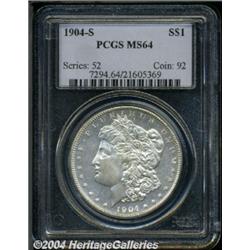 <B>1904-S<S$1> MS64 PCGS.</B></I> Although once considered an easily obtainable date, the '04-S was not well represented in the Treasury releases of the early 1960s. Today, numismatists consider this date to be scarce to rare in all grades, especially those that approach the Gem threshold. The luster quality on both sides of this Choice representative is solid for the grade. The partially reflective surfaces exhibit a pleasing cartwheel effects that is undisturbed by all but a few tiny bagmarks. Typically struck for the type. <BR><BR><B>Important notice:</B> Heritage usually auctions material at the rate of 200-250 lots per hour. On some occasions eBay Live bid software or the Internet may not be able to keep up with the pace of the auction. We recommend placing a realistic absentee bid now as insurance to avoid disappointment. Occasionally the auctioneer may eliminate or reject an eBay Live bid, and the auctioneer may also reopen a lot after the close of the eBay live bidding (usually because we missed an audience bid), and may reject your bid even if it shows you as the winning bidder. By bidding via eBay Live, you agree that Heritage may award the lot to another bidder at its sole discretion under the circumstances described above or any other reasonable circumstances. Since eBay bids are not shown to us until we open the lot on the floor, we treat those bids just like floor bids. In most cases the floor responds before the eBay bid is presented to us, due to Internet lag time, so for consistency we have made it a policy that floor bids are always considered first over tie eBay live bids. Also please note that all Heritage lots purchased through eBay Live carry a 20% Buyer's Premium. Please make sure you read the Terms and Conditions before you bid. </span></font></tr></table></td></tr></table>