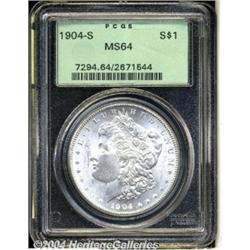 <B>1904-S<S$1> MS64 PCGS.</B></I> A crisply struck, faintly toned, and highly lustrous better date Morgan Dollar. The reverse is impressively devoid of marks, and only an occasional wispy luster graze denies classification as a full Gem. With tens of millions of Silver Dollars stored unwanted in Treasury vaults, production of the denomination ceased after 1904, and did not resume until it was required by the Pittman Act of 1918. <BR><BR><B>Important notice:</B> Heritage usually auctions material at the rate of 200-250 lots per hour. On some occasions eBay Live bid software or the Internet may not be able to keep up with the pace of the auction. We recommend placing a realistic absentee bid now as insurance to avoid disappointment. Occasionally the auctioneer may eliminate or reject an eBay Live bid, and the auctioneer may also reopen a lot after the close of the eBay live bidding (usually because we missed an audience bid), and may reject your bid even if it shows you as the winning bidder. By bidding via eBay Live, you agree that Heritage may award the lot to another bidder at its sole discretion under the circumstances described above or any other reasonable circumstances. Since eBay bids are not shown to us until we open the lot on the floor, we treat those bids just like floor bids. In most cases the floor responds before the eBay bid is presented to us, due to Internet lag time, so for consistency we have made it a policy that floor bids are always considered first over tie eBay live bids. Also please note that all Heritage lots purchased through eBay Live carry a 20% Buyer's Premium. Please make sure you read the Terms and Conditions before you bid. </span></font></tr></table></td></tr></table>