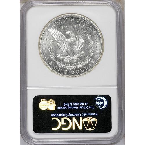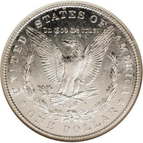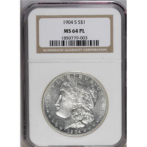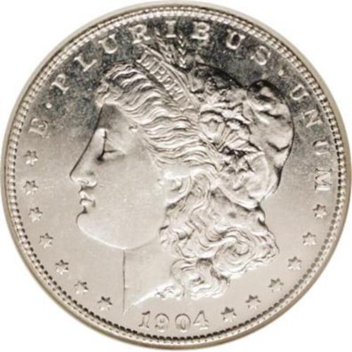 <B>1904-S<img border='0' src='http://www.heritagecoins.com/images/star.gif' width=10 height=10>$1> MS64 Prooflike NGC.</B></I> The 1904-S is a scarce coin even when not found prooflike. As a Prooflike or DMPL it is a major rarity. Only eight other pieces have been so graded by NGC with five finer, and PCGS has certified only nine coins with three finer (8/06). This is a deeply mirrored example that displays little mint frost over the devices--the Prooflike designation is derived from the depth of the mirrors rather than any field-to-device contrast as might be seen on earlier dates. Brilliant throughout, there are no noticeable or distracting marks on either side. A bit weak in the centers, as with all '04-S dollars, because of the use of the C4 reverse die.