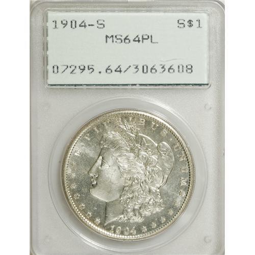 <B>1904-S S$1 MS64 Prooflike PCGS.</B></I> Moderate contrast is noted on each side, with deeply mirrored fields, and there are few singular abrasions noted on the brilliant surfaces. The strike on each side is typical for the issue. Certified in a first-generation small-size holder. PCGS has certified nine Prooflike coins in this grade, with three finer (3/07)<BR><BR><b>Shipping:</b> Coins & Currency (<a target="_blank" href="http://www.heritageauctions.com/common/shipping.php">view shipping information</a>)