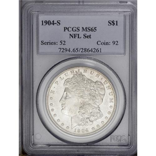 <B>1904-S<img border='0' src='http://www.heritagecoins.com/images/star.gif' width=10 height=10>$1> MS65 PCGS.</B></I> Ex: NFL Set. Delicate tan patina enriches this intricately struck and lustrous Gem. The fields are unusually clean, and the devices exhibit only minor contact. The reverse is lightly die doubled, visible under magnification on the right (facing) wing, TRUST, and OF. All San Francisco dollars issued between 1898 and 1904 are scarce in Mint State, but among these issues, the 1903-S and 1904-S are the most elusive. Perhaps due to Pittman Act melting or the traditional Western mistrust of paper money, the 1904-S went primarily into circulation, and remaining Gems are highly prized by specialists. Population: 91 in 65, 11 finer (1/06).<BR><I>Ex: Gregg Bingham NFL Collection (Heritage, 1/01), lot 7999.</B></I><BR><I>From The Michael Casper Collection, Part Three.</B></I>