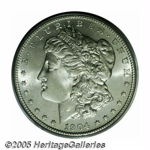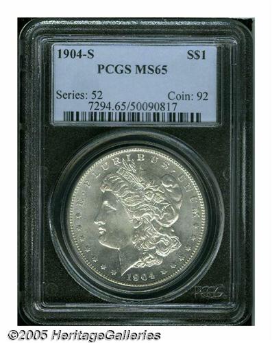 <B>1904-S<S$1> MS65 PCGS.</B></I> While the Treasury Raid of 1962-1964 resulted in many previously rare Morgan Dollars becoming common overnight, the absence of numerous Mint State examples in this release had the opposite affect on the 1904-S. Considered an easily obtainable issue through the 1950s, the '04-S became a significant condition rarity the following decade. Today, the scarcity of Gem quality survivors is well known to Morgan specialists. The present example displays smooth, lustrous surfaces that do full justice to the grade. Both sides are well struck with an untoned, fully brilliant appearance overall. Population: 91 in 65, 10 finer (4/05).