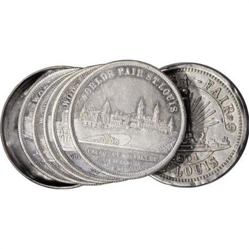 <B>1904 St. Louis World's Fair Box Set of Five Palace Dollars.</B></I> Aluminum, 36 mm. Five medals struck for the St. Louis World's Fair, including <B>HK-316, HK-319, HK-320, </B></I>and <B>HK-322a.</B></I> The medals come with the original round metal box as listed in the Hendershott catalog number 30-570, manufactured by Schwabb of Milwaukee. The medals all have some wear and grade Extra Fine.<BR><BR><b>Shipping:</b> Coins & Currency (<a target="_blank" href="http://www.heritageauctions.com/common/shipping.php">view shipping information</a>)