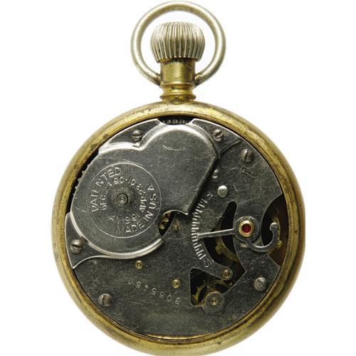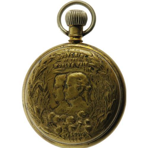 <B>1904 St. Louis World's Fair Souvenir Pocket Watch.</B></I> Sensational pocket watch with a color image of "The Cascades" pictured on the face. The "Cascades" was the famous set of waterfalls that stood in front of the Grand Basin at the fair. Scott Joplin wrote "The Cascades" after being inspired by this image. On the back are nicely embossed images of Napoleon & Jefferson with "Souvenir of the World's Fair - St. Louis 1904" and a decorative floral border design. Open the back of the watch and the intricate workings of the inside are visible along with the original patent information. On the inside lid is the original paper guarantee and instructions for the watch. The crystal is now missing; the watch no longer works; slight "aging" on the finish. 50 mm wide x 70mm tall.