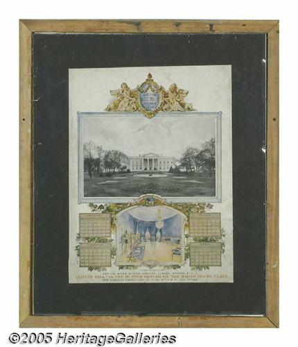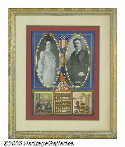 <B>1904 Teddy and Edith Roosevelt White House Calendar Page</B></I> From the "New White House Calendar" of 1904 issued compliments of the Fox River Butter Company of Aurora, Illinois, here is a full page showing the months of May and June. Featured on this colorful page are the jugate portraits of Theodore Roosevelt and Mrs. Roosevelt, who was the former Edith Kermit Carow, Teddy's second wife. Also on this page are pictures of the President's Study and the Private Dining Room. Copyright 1903 by the White House Calendar Company. This page, sight size 8.5" x 11.5", is attractively double matted and framed to an overall size of 15" x 17.5". On the verso of the frame is the cover of this same calendar laid down on mat board and covered by plexiglass. It features photos of the White House, the Blue Room and the calendar months of January through April. A unique and gorgeous display item. Lot:261