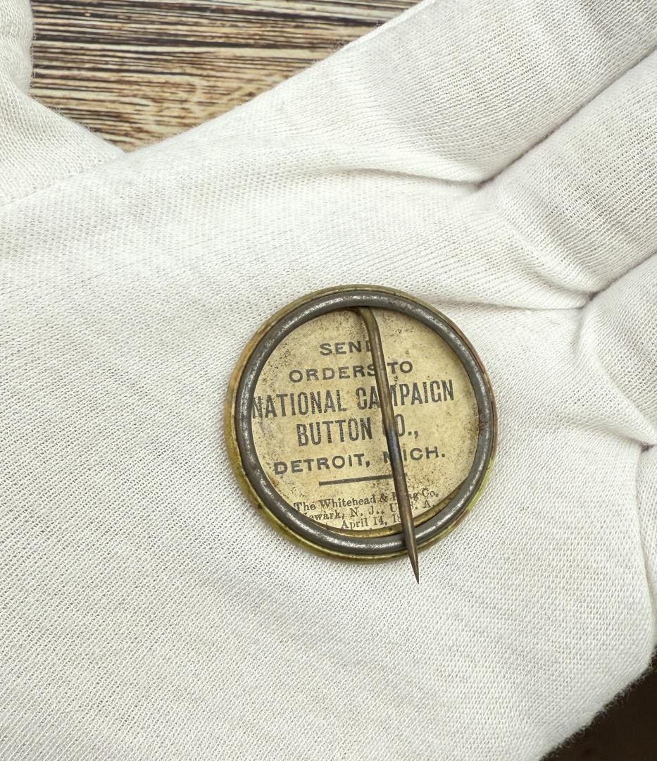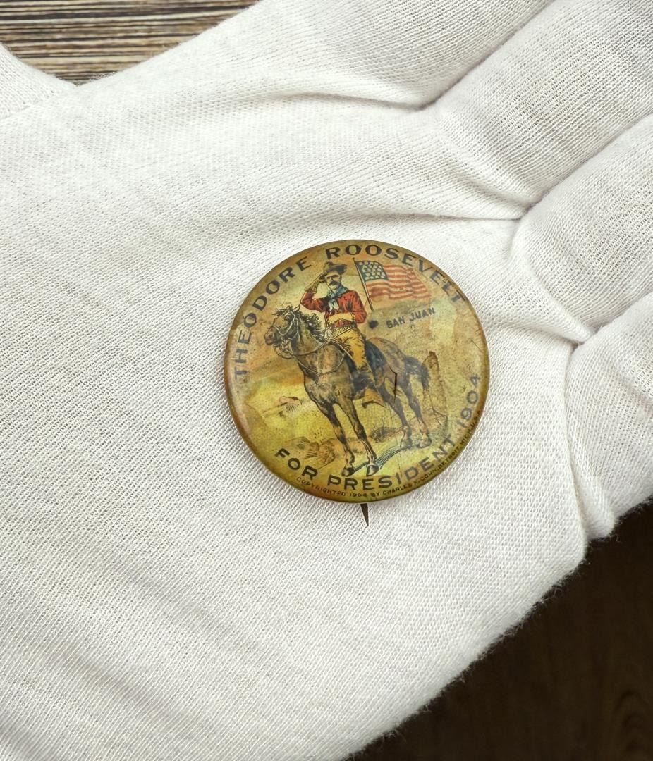 Very nice iconic Celluloid Political Campaign Button. San Juan Hill imagery. 1 1/8" diameter.