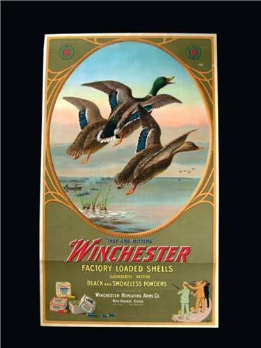 1904 Winchester Poster for factory loaded shells. Depicting three flying ducks, framed and matted. Minor horizontal creases otherwise excellent condition. 15 1/2 X 26 inches.