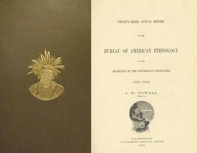 ''Twenty-Third Annual Report of the Bureau of American Ethnology to the Secretary of the Smithsonian Institution, 1901-02'' by J.W. Powell. Washington: Government Printing Office: 1904. 634pp. book contains an Administrative Report with historical information on the Zuni Indians. Measures approximately 7.5'' x 11.5'' and contains more than 100 color plates and photographs. Mild wear and scratches on avocado cloth boards. Handsome Indian Chief bust in gilt on front cover. Binding very loose in places, yet intact. Good condition.