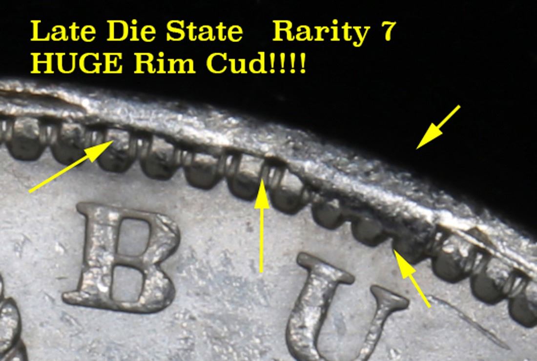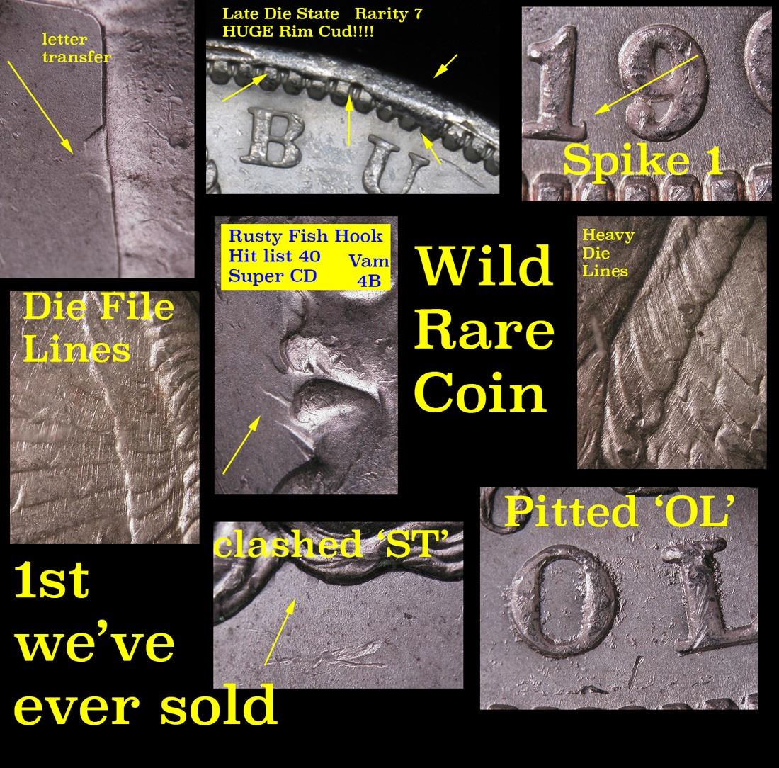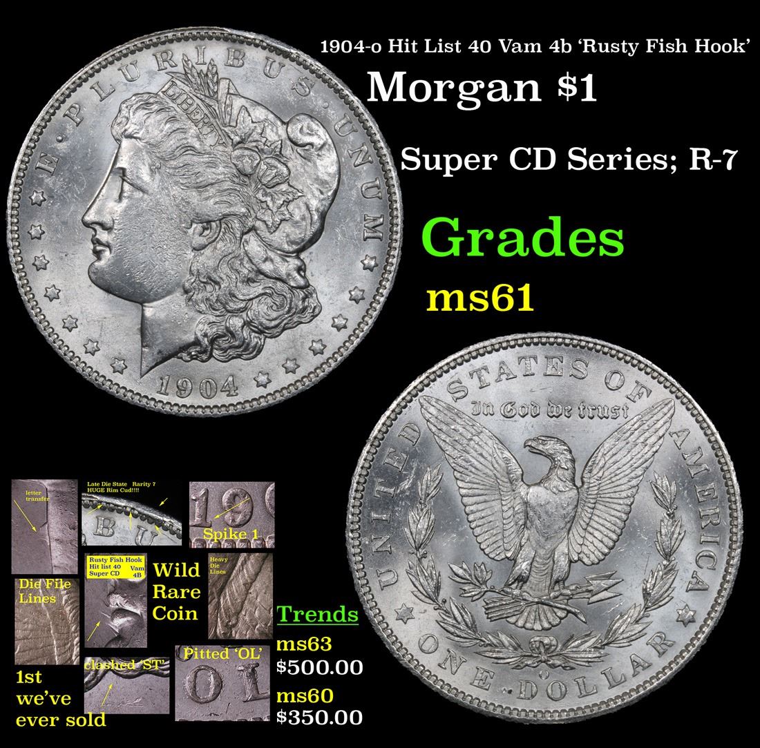 1904-o Hit List 40 Vam 4b 'Rusty Fish Hook' Super CD Series; R-7 . Morgan Dollar $1 Grades BU+. Increadibly Rare Varity; Late Die State With the wild rim cud on obv. The Late Die State Raises this Rarity 6 varity to a Ratity 7 Level. Tons going on in theis coin pitting going on in the rev in dollar die file lines throughout the eagles wings. Huge die clash appearing to be a rusty fish hook in miss libertys mouth. Amazinng coin first one we have ever sold. Plus the very Cool Spiked 1 in the date A Corey's Pick, Bid to Win, Don't let it get Away Coin