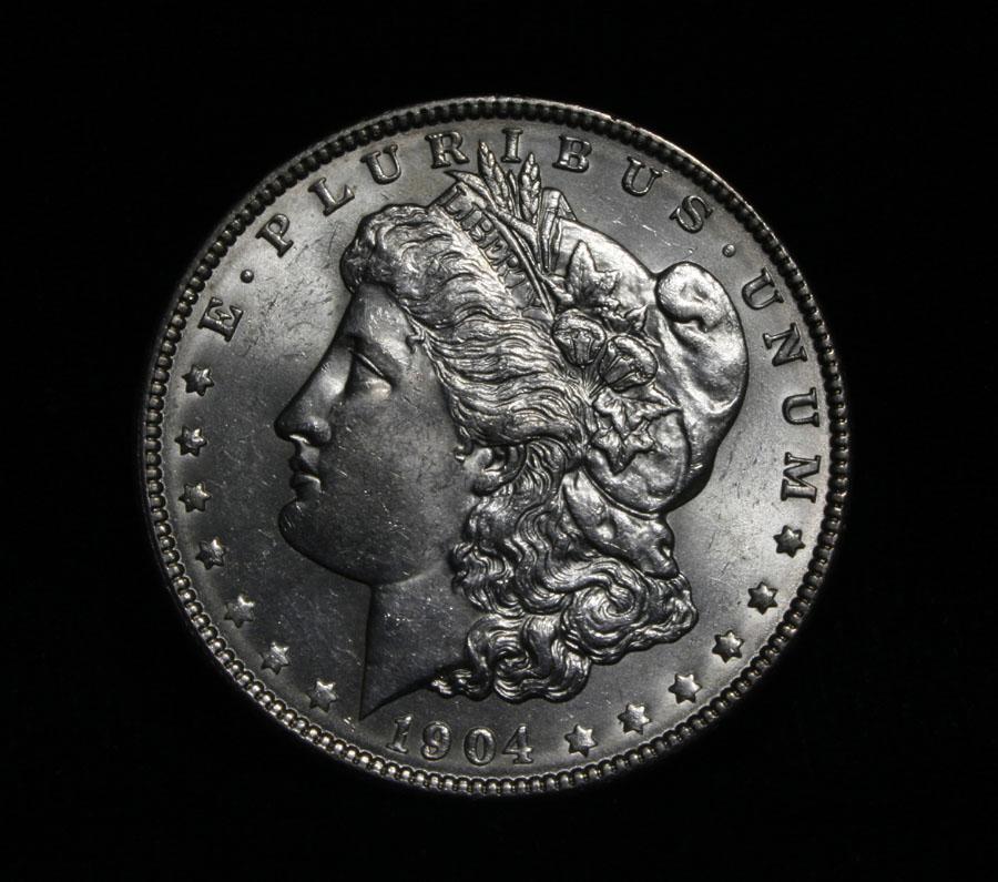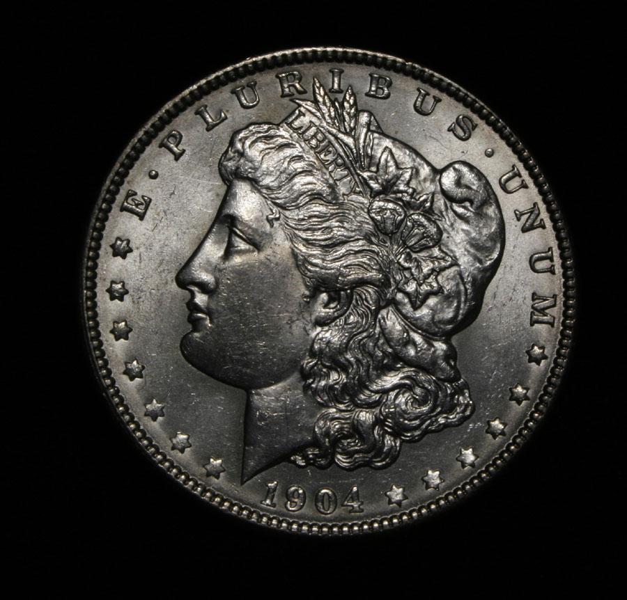 Very attractive Blast white coin with superior luster. This was the Final year of the Morgan Dollar, with the original pattern dies. The 1921 coins were made with full recreated dies and are really a one year type coin. The 1904 is the final year of the Original Moran Series. Coin World's Coin Values lists ms64 at $1000, and wholesale Greysheet on an ms64 is $480. Estimated Value $500