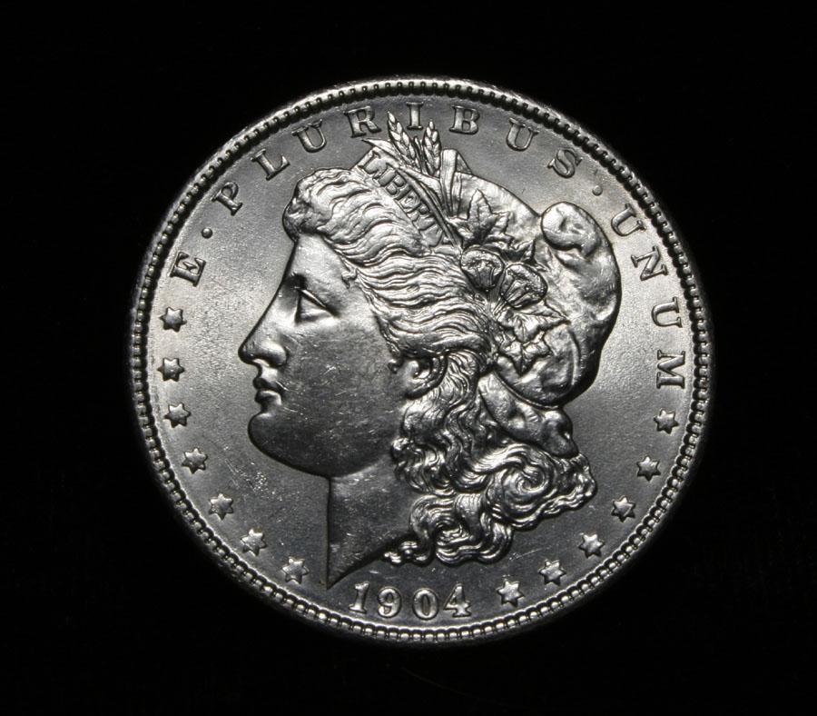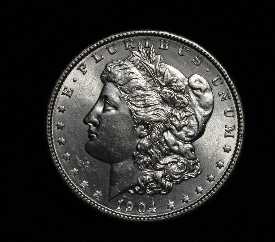 Very nice coin with blazing luster. Final year of the Morgan Dollar, with the original pattern dies. The 1921 coins were made with full recreated dies and are really a one year type coin. The 1904 is the final year of the Original Moran Series. Coin World's Coin Values lists ms64 at $1000, and wholesale Greysheet on an ms64 is $480. Estimated Value $500