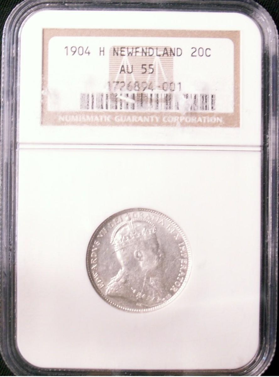 1904H Nfld 20¢ NGC AU55. Blast white and lustrous.