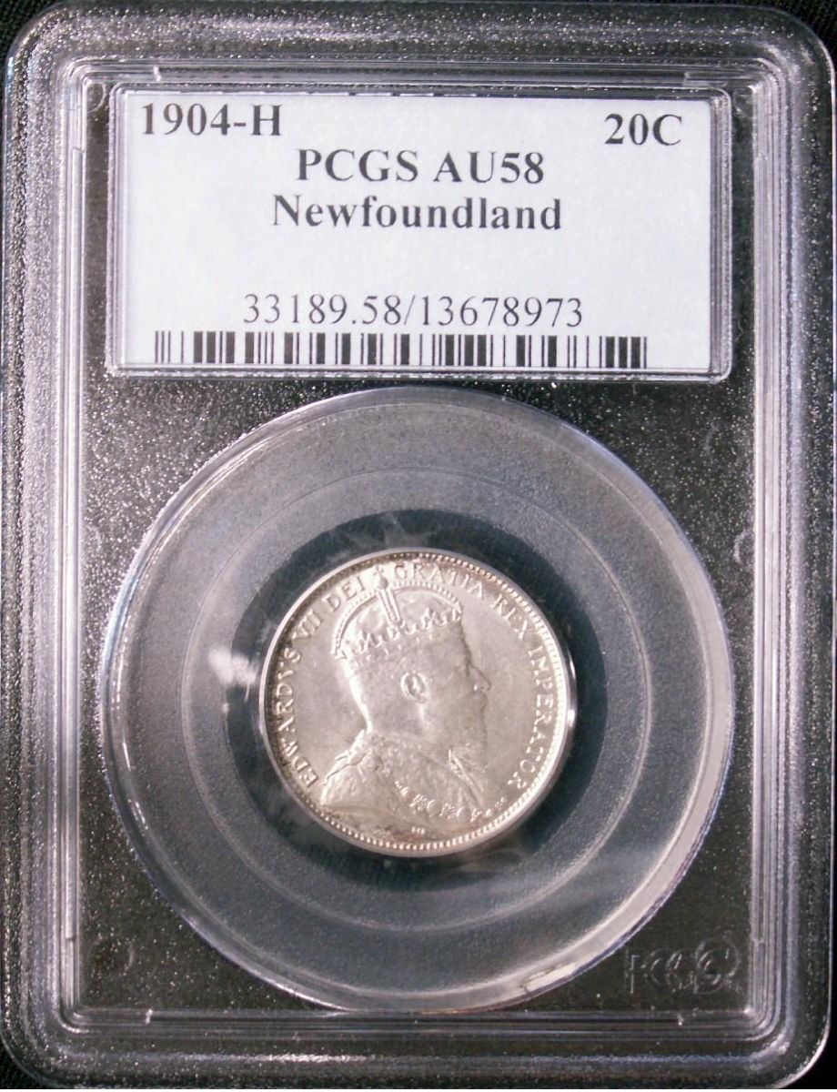 1904H Nfld 20¢ PCGS AU58. Quite attractive with toned reverse and white obverse.