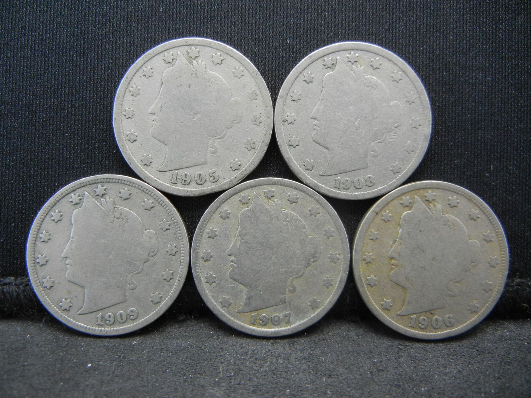1905, 06, 07, 08, 09 Liberty Head V Nickels (5) Total