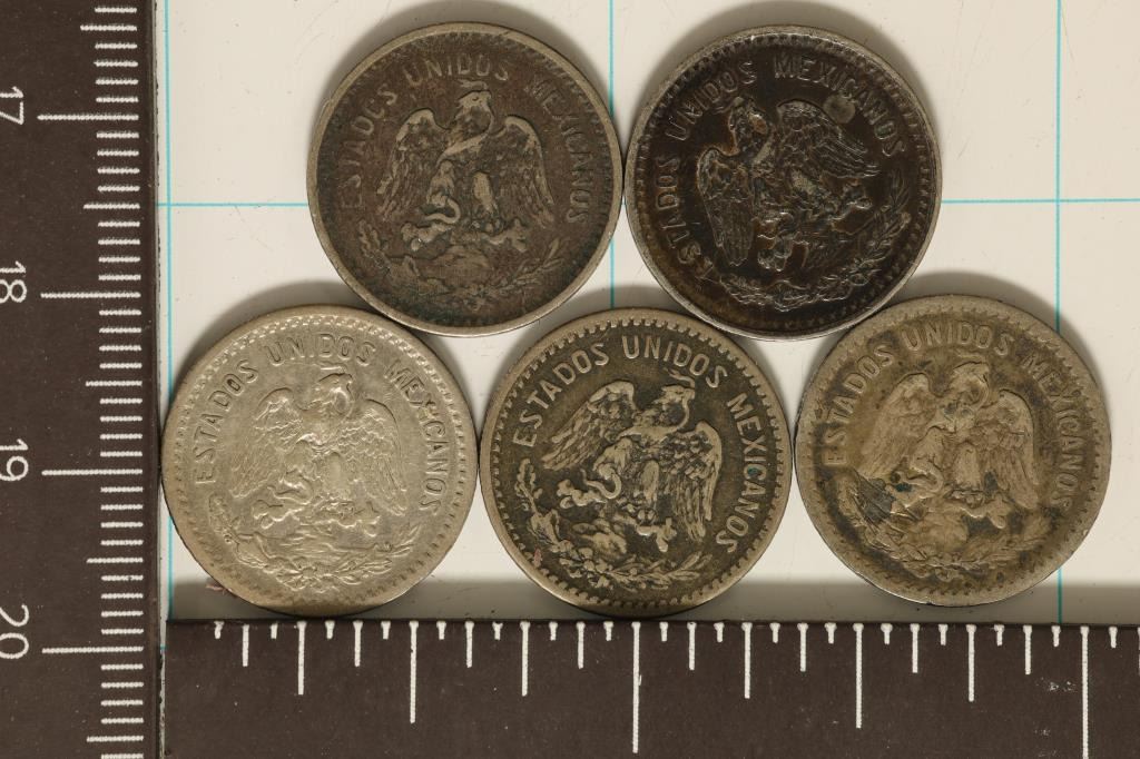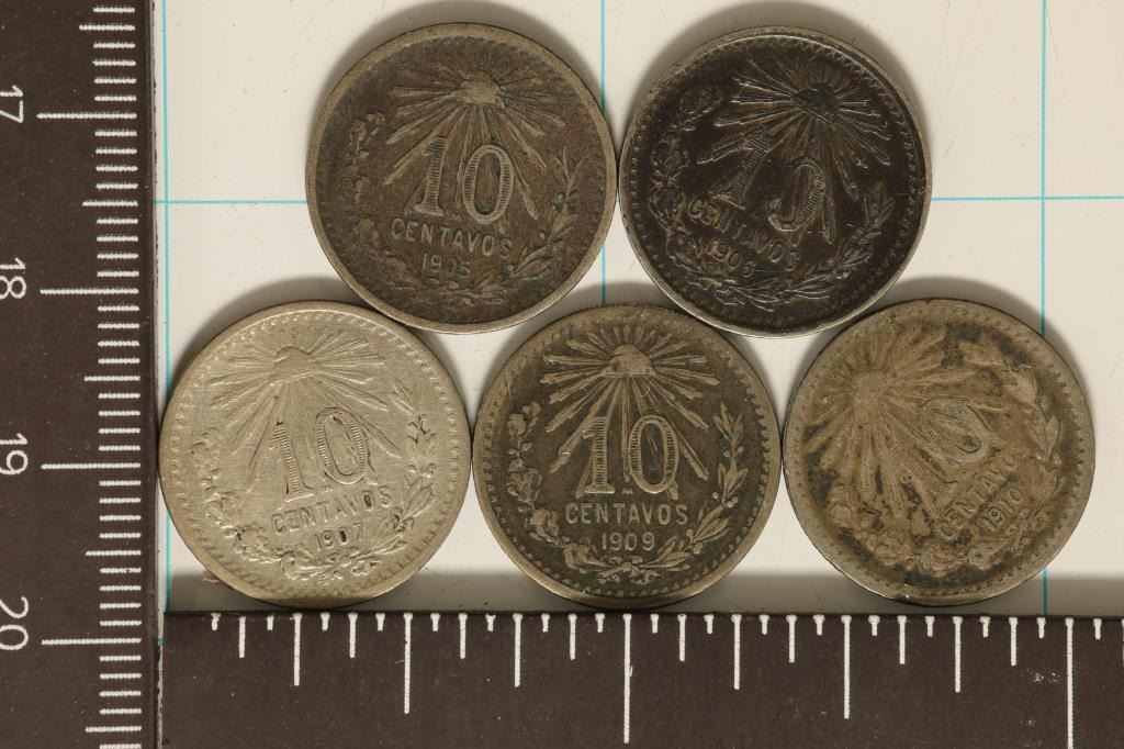 1905, 06, 07, 09 & 1910 MEXICO CAP & RAY SILVER 10