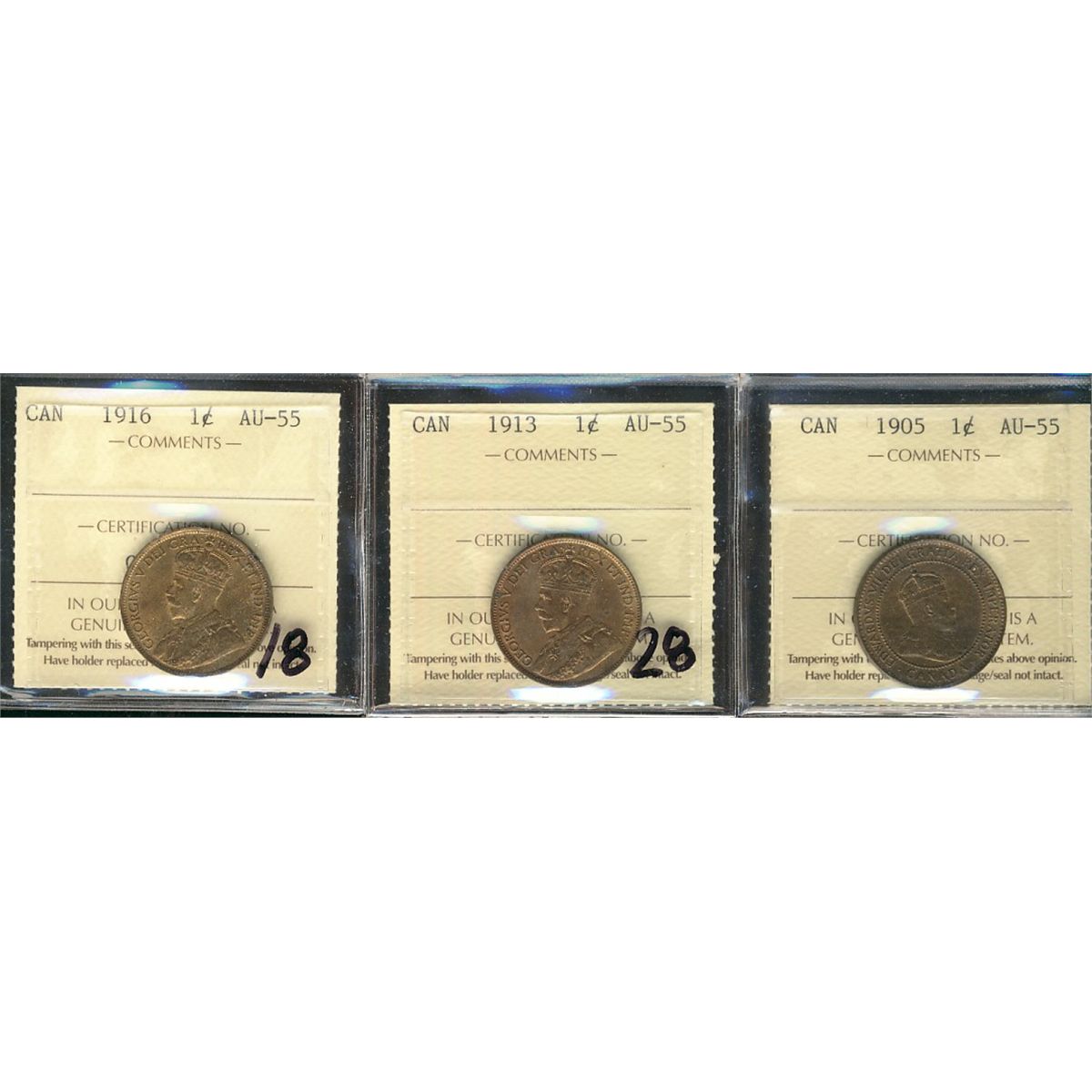 1905 1¢, 1913 & 1916 ICCS AU55. Lot of 3 coins.