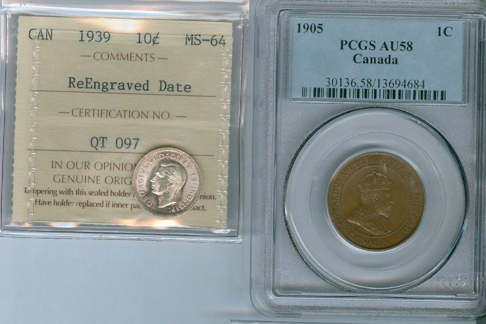 1905 1¢ PCGS AU58 & 1939 Re engraved date 10¢ MS64. Lot of 2 coins.