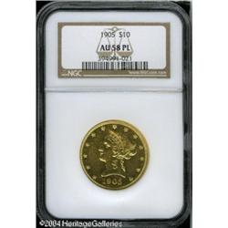 1905 $10 AU58 Prooflike NGC. A needle-sharp and mo <B>1905 $10 AU58 Prooflike NGC.</B></I> A needle-sharp and moderately abraded representative with decidedly reflective fields. No highpoint friction is readily evident. As of (11/04), this is the only 1905 Eagle certified as Prooflike by NGC. <BR><BR><B>Important notice:</B> Heritage usually auctions material at the rate of 200-250 lots per hour. On some occasions eBay Live bid software or the Internet may not be able to keep up with the pace of the auction. We recommend placing a realistic absentee bid now as insurance to avoid disappointment. Occasionally the auctioneer may eliminate or reject an eBay Live bid, and the auctioneer may also reopen a lot after the close of the eBay live bidding (usually because we missed an audience bid), and may reject your bid even if it shows you as the winning bidder. By bidding via eBay Live, you agree that Heritage may award the lot to another bidder at its sole discretion under the circumstances described above or any other reasonable circumstances. Since eBay bids are not shown to us until we open the lot on the floor, we treat those bids just like floor bids. In most cases the floor responds before the eBay bid is presented to us, due to Internet lag time, so for consistency we have made it a policy that floor bids are always considered first over tie eBay live bids. Also please note that all Heritage lots purchased through eBay Live carry a 20% Buyer's Premium. Please make sure you read the Terms and Conditions before you bid. This lot is being auctioned in conjunction with a live floor auction by Heritage Galleries & Auctioneers. All final auction and invoice information will be supplied by Heritage Galleries & Auctioneers, and all other information should be considered preliminary. Lot:6791