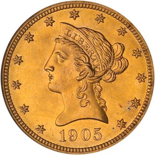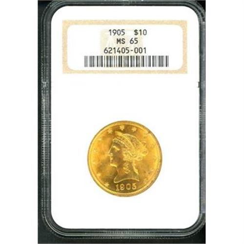 <b>1905 $10 Liberty. NGC graded MS65.</b> Strong metal flow augments the already showy orange gold mint luster that covers the surfaces, giving the coin a brand new, glowing appearance. The mint brilliance is only broken up by an rare overlay of this pale patina. A rounded impression is the bugaboo for many Liberty $10 gold pieces imprinted by the stamp of the dies that struck this date; we are happy to say that the present example is a grand exception to that rule in being very sharp throughout including centers <b>(PCGS # 8757)</b>