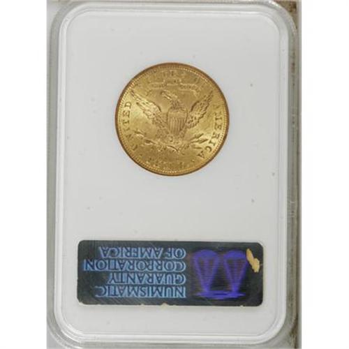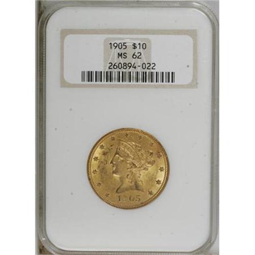 <B>1905 $10 MS62 NGC.</B></I> NGC Census: (530/288). PCGS Population (403/245). Mintage: 200,900. Numismedia Wsl. Price for NGC/PCGS coin in MS62: $380. (#8757)<BR><BR><B>Coin Engraver:</B> Christian Gobrecht<BR><BR><b>Shipping:</b> Coins & Currency (<a target="_blank" href="http://www.heritageauctions.com/common/shipping.php">view shipping information</a>)