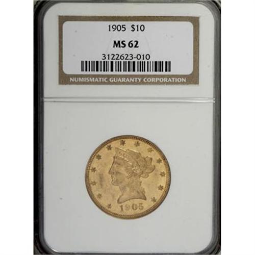 <B>1905 $10 MS62 NGC.</B></I> . NGC Census: (552/295). PCGS Population (442/255). Mintage: 200,900. Numismedia Wsl. Price for NGC/PCGS coin in MS62: $495. (#8757)<BR><BR><B>Coin Engraver:</B> Christian Gobrecht<BR><BR><b>Shipping:</b> Coins & Currency (<a target="_blank" href="http://www.heritageauctions.com/common/shipping.php">view shipping information</a>)