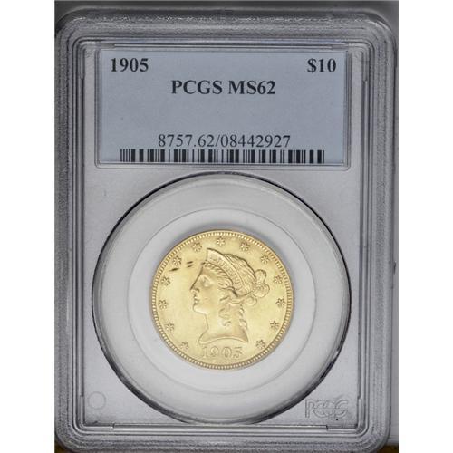 <B>1905<$10> MS62 PCGS.</B></I> Bold impressions are noted on the design elements of this lustrous eagle, that shows somewhat more "flash" on the obverse. A few minute marks are scattered about the obverse, which also reveals three toning streaks in the upper left quadrant.<BR><I>From The Jackson Hole Collection.</B></I>